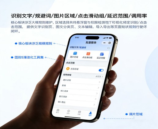 1、批量替换覆盖“识别文字/规避词/图片区域/点击滑动组/延迟范围/调用率”等核心字段,适合大规模规则维护; 2、区域选择支持悬浮窗与权限检测,便于可视化标定识别/点击范围; 3、提供文字识别页、图文分类页、文本编辑、导入导出等页面,完善规则迭代闭环。