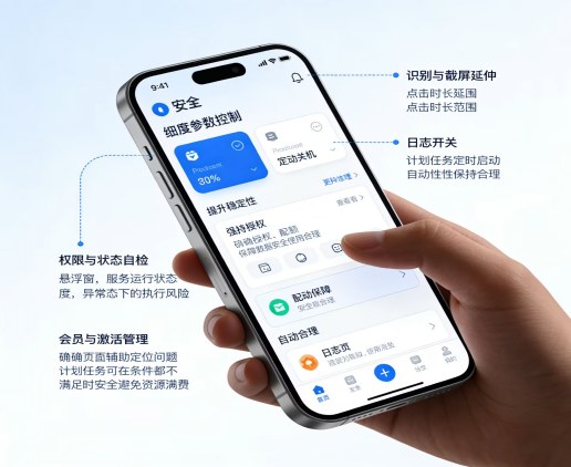 1、细粒度参数控制:识别与截屏延迟、点击时长范围、日志开关、计划任务定时启动、自动关机等,提升稳定性和可控性; 2、权限与状态自检(悬浮窗、服务运行状态),减少异常态下的执行风险; 3、会员与激活管理,明确授权与配额,保障数据安全与使用合规; 4、异常与日志页辅助定位问题;计划任务可在条件不满足时安全停止,避免资源浪费。